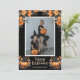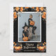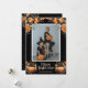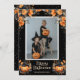 Custom black photo Halloween card featuring a photo adorned with watercolor jack-o'-lanterns wearing black hats, orange flowers and greenery. Easily personalize this cute photo Halloween card with your photo and the family name. This photo Halloween card can be turned into any colour using the customization tool.