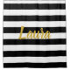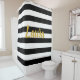 Personalize the faux gold script on this black-and-white striped shower curtain with your desired text.