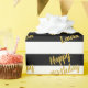 Personalize your faux (not foil) gold script on a black and white striped pattern background. Display text, 'Happy Birthday Laura', can be changed to your desired message such as congratulations or thank you with the recipient's name.