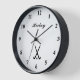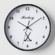 Custom field hockey sports wall clock. Custom clock for fans and players. Personalized gift idea. Sporty design with black and white image of crossed hockey sticks and ball. Great for home or club.