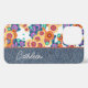 Contemporary bright purple, blue, green, pink, orange, and red floral pattern on a faux blue jeans denim background. With room to customize or personalize with a name, monogram, or initials of your choice. Beautiful, modern, and cool cover for the trend-savvy and art-loving hip trendsetter, artsy motif lover who wants to protect their phone from dust and dirt, wear and tear. This design is available in Apple iPhone 6, 7, and 8 Plus, 10 or X, XR, XS, 11, 12, 13 Mini, 14, 15 Plus, and Pro Max cellphone cases. Show off your style, look fashionable trendy, and feel stylish with a unique design on a mobile device accessory of your choice.