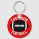 A cool customizable football keychain for football players, coaches, teams and fans, with a black football graphic in the center and the option to change the background color to any color you want! Just type your own football team name or any other text (school name, team slogan, mascot, football player name, etc.) in the custom text box. Then click the [Customize] button and use the color picker tool to change the background color (currently set on red) to any color you want! Makes a sweet gift idea for football lovers, and affordable enough to get one for every player and coach on the team!
