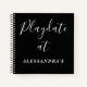 Personalized funny spiral notebook with the name of the host which organizes the playdate. Simple neutral minimalist design, black background and white custom text. “Play date at the name” humorous quote phrase saying slogan for a notebook to keep score tracks on the fun gatherings with family and friends at a card play, corn hole, dartboard or other relaxing games. For your family or as a thoughtful custom gift under 25 dollars for the perfect hosts. Attractive combination of trendy script handwritten calligraphy and modern clean sans serif font. Make a pause from electronic devices and enjoy playing something offline. Unisex gender neutral versatile item.