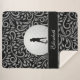 Your favourite golfer will love this design created especially for her. Female golfer silhouette is positioned on a realistic image of a golf ball. A coordinating ribbon completed in trendy sophisticated black is positioned slightly below the golfer and is the template for custom name or text in white script calligraphy. The background is chic black and features a contemporary pattern of swirls and leaves in coordinating popular ultimate grey. ALL colours in this design may be customized!