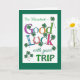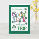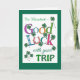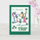 A Good Luck with your Trip greeting card to personalise, with brightly coloured lettering, four-leaf clovers and a horseshoe for luck! A text-based,