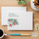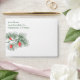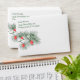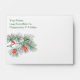 Custom A6 holiday envelopes with custom green text, a pine branch with red pinecones on the front, and a blue and green pine pattern lining the inside.