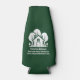 This forest green real estate company bottle cooler is perfectly customized for a realtor who specialized in houses near the wilderness or woodlands. The white silhouette of trees behind a log cabin home and personalized with your agent and realty business name for marketing in the backwoods.