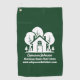 This forest green real estate company golf towel is perfectly customized for a realtor who specialized in houses near the wilderness or woodlands. The white silhouette of trees behind a log cabin home and personalized with your agent and realty business name for marketing in the backwoods.
