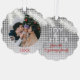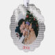 Design a contemporary classic Christmas holiday season ornament card featuring a grey and white plaid tartan gingham style background. This card offers the ability to customize the text, family name, and year date, insert a personal photo on the front, and include a customizable seasonal greeting message on the back.