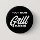 Custom Grill Master buttons for BBQ party. Cool black and white script typography design. Fun summer Birthday party gift idea for cook, dad, husband, uncle, brother, grandpa, retired person, boss, coworker, colleague, grill king, business, guests etc. Personalize with a name or monogram. Personalized gifts for people who love grilling.
