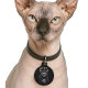 Custom Grim Reaper Sphynx Cat Funny Pet ID tag for cats. Featuring a realistic Sphynx cat grim reaper in a black hooded robe with skeleton hands holding a scythe, an exclusive 'Sphynx Cat Art' design cat id tag. Add Sphynx Cat owner's contact information on the back of this identity pendant cat ID tag, and the cat's name on the front. A must-have for any cat parent, in the event that your hairless Sphynx cat or kitten escapes or gets lost.