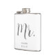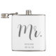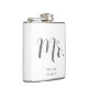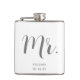 A modern white and grey personalized script custom Mr. Groom name wedding dated flask. Personalize this for a wedding party gift keepsake, and or an engagement gift.
