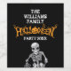 Cool custom annual family Halloween party wine label that features a creepy skeleton hanging over spooky orange and black text and an awesome Jack O Lantern. Customize these labels with your big bash information for all of your guests.