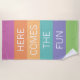 Happy bright coloured beach towel with lime green, hot pink, vibrant orange, aqua turquoise and violet purple stripes pattern, and fun HERE COMES THE SUN quote text. Celebrate summer time... beach time, pool time, fun time!