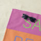 Happy bright coloured beach towel with lime green, hot pink, vibrant orange, aqua turquoise and violet purple stripes pattern, with a cute seahorse silhouette and fun SAND BEACH SURF OCEAN quote text. Celebrate summer time... beach time, pool time, fun time!
