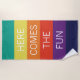 Happy bright coloured beach towel with jade green, sun yellow, vibrant orange, bold red, purple and dark blue stripes pattern, and fun HERE COMES THE SUN quote text. Celebrate summer time... beach time, pool time, fun time!