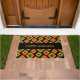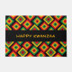 Custom HAPPY KWANZAA doormat with vibrant and colourful geometric squares pattern in reds, yellows and greens against a rich black background. HAPPY KWANZAA is CUSTOMIZABLE so you can add your family name, 'Welcome' or other text. Ideal outdoor porch decor during Kwanzaa season.