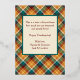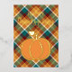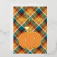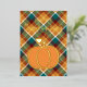 Unique, classy, trendy, pretty and decorative seasonal Happy Thanks greeting card. With room to customize or personalize family name or names, and text of your choice. Cute golden pumpkin on a maroon red, dark teal green, orange and ivory off-white coloured plaid tartan gingham check pattern.
