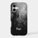 A custom iPhone case with white grunge type letters and a spooky Halloween sky with misty, dark trees along a spooky road, gothic ravens and a cloudy full moon in black and white.