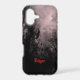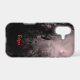 A custom iPhone case with red grunge type letters and a spooky Halloween sky with misty, dark trees along a spooky road, gothic ravens and a cloudy full moon with a red mist.