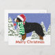 Personalized Festive Christmas Holiday Bernese Mountain Dog dressed in santa hat and green and white scarf holding red polka dot christmas ornament in its mouth. Snowy winter background. Cute christmas postcard for berner lovers!