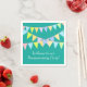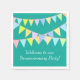 Custom housewarming party napkins for new home. Cheerful design with coloured pennant flags on a string. Great for moving celebrations with friends and family. Add your own personalized text to celebrate your new address. Perfect for cocktails, BBQ or dinner.