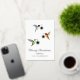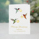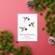 Cute custom Christmas card featuring a ruby-throated hummingbird, a rufous hummingbird and a female Anna's hummingbird carrying star ornaments. The inside message is "Wishing you a season full of light and laughter for you and your family." The text can be changed or deleted for your own handwritten message.