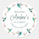 This pretty customizable sticker is featuring a watercolor wreath of hummingbirds and botanical branches on a white background. The font size and font style can be changed by clicking on "Edit using design tool". All hummingbird images are taken from original watercolors by C. Dobbins.