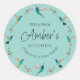 This pretty customizable sticker is featuring a watercolor wreath of hummingbirds and botanical branches on an aqua blue background. The font size and font style can be changed by clicking on "Edit using design tool". All hummingbird images are taken from original watercolors by C. Dobbins.