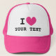 Custom I HEART trucker hat with pink love icon. Make your own personalized cap with this blank template. Custom colour heart with black typography.