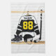 A unique and fun sports design with a personalized ice hockey jersey hanging in a locker room with a helmet, ice skates and a hockey stick. The jersey can be fully personalized with the number and name of your choice to make a great gift for any ice hockey fan, ice hockey coach or ice hockey player.