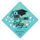 Celebrate your big day with this inspirational typography light blue cap topper featuring a motivational quote that reads "And now the limit is the sky" decorated with little white clouds and golden stars and with a black graduation cap with tassel. Easily customize this topper with your name and graduation year.
