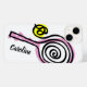 Custom iPhone 14 case design for tennis players. Personalized phone cover with artistic design of pink tennis racket and yellow tennis ball. Add your own name, quote or monogram letters. Sports art drawing of tennis racquet. Customizable Birthday presents for sporty men women and kids. Elegant gift idea for player, fan and coach. Stylish brush script typography. Create one for mom, sister, daughter, friend, team mate, doubles partner, trainer, teacher, grandma, cousin, girl etc. S8 S7 accessories for her.