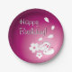 A set of purple birthday paper plates with an illustration of two Japanese snow rabbits, two sakura flowers, and four sakura flower petals on the lower right corner, and the customizable words "Happy Birthday!" on the left.