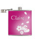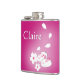 A purple liquor flask with an illustration of two adorable and cute snow rabbits, two sakura flowers, and four sakura flower petals on the lower right corner, with the option of customizing your name on the left.