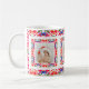 Custom Jolly Christmas Pattern Photo Picture Tea Coffee Mug. In traditional colours of red, blue and green, with hints of warm pink and bright orange; in a merry multicolour, maximalist pattern. For winter warmer drinks and cheerful hot chocolate on cosy nights in. Change the three photos to your own pictures to celebrate family memories. Buy as a budget friendly festive keepsake tableware gift for her or grandparents.