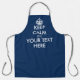 Custom keep calm and carry on large navy blue kitchen Apron for men and women. Modern typography template with crown silhouette. Personalized cooking aprons in any colour. Trendy template with fun typography design. Add your own name or humourous quote. Create your own unique Birthday party gift for mom, grill master, dad, sister, brother, father, mother, wife, husband, friend, grandma, grandpa, kids, boss, co worker, BBQ chef, cook, colleague, wedding couple etc. Available in small, medium and big size. Also great for dinner party, baking, dish washing, art & crafts work etc. Make a his and hers for him and her. Humour presents for friends and family.