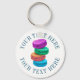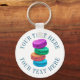 Custom keychain with French macaron cookie drawing. Cute key chain with personalized text and colourful illustration. Fun Birthday gift idea for friends, family, coworker, colleague, kids etc. Pink, green, orange and blue colours. Pasty sweets in different flavours with elegant text template.