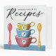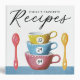 This custom recipe cookbook binder features a charming design of kitchen measuring cups and spoons in shades of red, yellow and blue, with denim blue accents. Personalize with your name on the front and on the spine of the binder. Makes a wonderful gift for bridal showers, birthdays, Christmas or even as a gift for yourself. Let your recipes shine with this custom recipe binder cookbook!