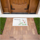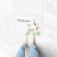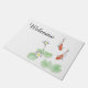 A white doormat featuring an idyllic Zen watercolor painting of two koi in a koi pond with white water lilies and water lily pads, with the customizable word "Welcome" on the left.