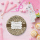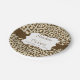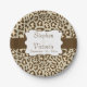 Chic, modern, pretty wild animal big cats leopard print paper plates in brown, tan, and peach with a brown stripe and white edged with brown banner that you can personalize with the wedding couple's names and wedding date!