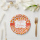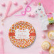 Chic, modern, pretty wild animal big cats leopard print paper plates in orange, yellow, and white with an orange stripe and white edged with orange banner that you can personalize with the wedding couple's names and wedding date!