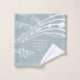 Elegant white and sea glass Christian Scripture shower curtain, designed with musical notes. There is customizable text that says LET EVERYTHING THAT HAS BREATH PRAISE THE LORD, which is based on Psalm 150 and which you can personalize to suit your requirements. In the bottom right hand corner, there is a customizable MONOGRAM.