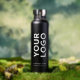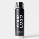 Advertise with your business logo, slogan, company name, website or other custom text on 2 sides of a branded black water bottle. Replace the sample logo and text with your own in the sidebar. White or light coloured logos will work best with the dark background. Your brand symbol can be any shape. This is eco friendly swag your employees, customers and clients will keep and appreciate!