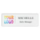 Easily personalize this name tag with your own company logo and employee name. You can choose a magnetic back fastener which is a good alternative to a pin for delicate fabrics and fine business attire. Custom name tags branded with your business logo look professional on your employees and staff, and they make a good impression at corporate events while also promoting your brand. No minimum order quantity.