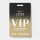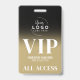 Event Your Logo Black Gold All Access VIP Badge. Great for fashion shows, concerts, large special events like conferences, speakers, and can even work for a birthday party or any other party where you want to make your guests feel special. A simple modern, yet elegant, look with a spot to add your company or even logo up top (or replace with a fun icon if doing for a birthday type of event). At bottom is a bold serif font mixed with simple typography, with VIP, the event name, date, and 'All Access Pass'. You can change all of the text information and colours of this badge (except the top black gradient.
