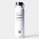 Advertise with your business logo, personalized QR code, and company name and website or other custom text on 2 sides of a branded white water bottle. Replace the sample logo, website URL, and text with your own in the sidebar. Your logo can be any colour and any shape. This is eco friendly swag your employees, customers and clients will keep and appreciate!
