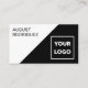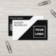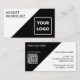 Modern black and white geometric business cards feature your logo on black and your name in black text on white on the front. The back features a customizable QR code, your job title/specialty/company name, and contact information on a reversed black and white colour block pattern to the front. Personalize the QR code with your portfolio or website link and add your logo and text in the sidebar. White, square logos will work best with this design.