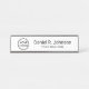 Name plate with interchangeable colour plastic insert. Simple, modern design with your custom logo on a white background and template fields for your name and title or company name.