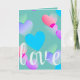 The design features colourful hearts and script typography of words of love suitable for celebrating Valentine's Day or any of the couple's special days. The front cover script, which reads "love" as well as the inside message which reads "Happy Valentine’s Day to the one who forever has my heart." are customizable. Colours featured in the hearts are shades of blue, red, pink, purple, and green.